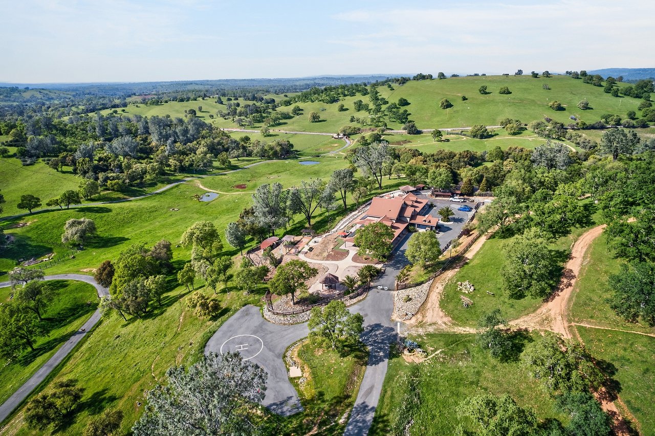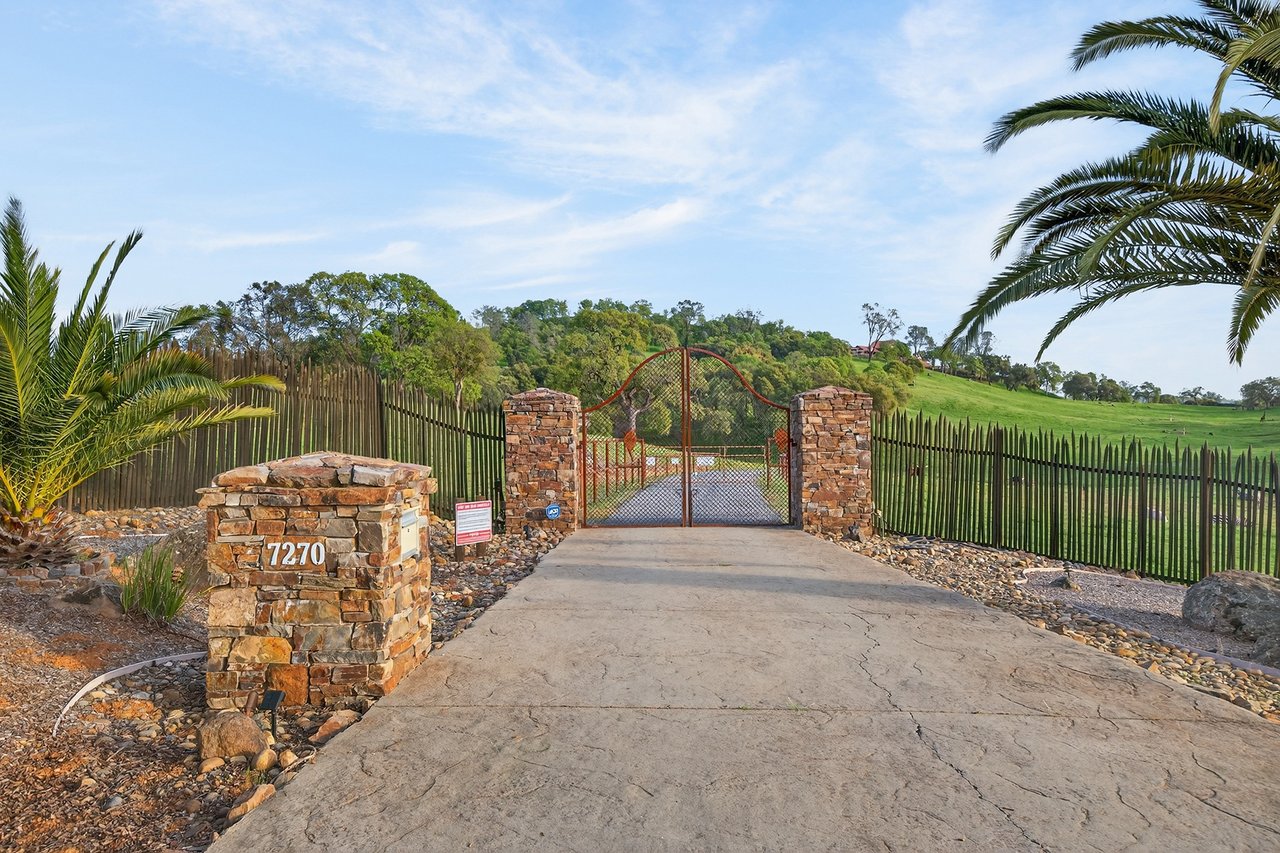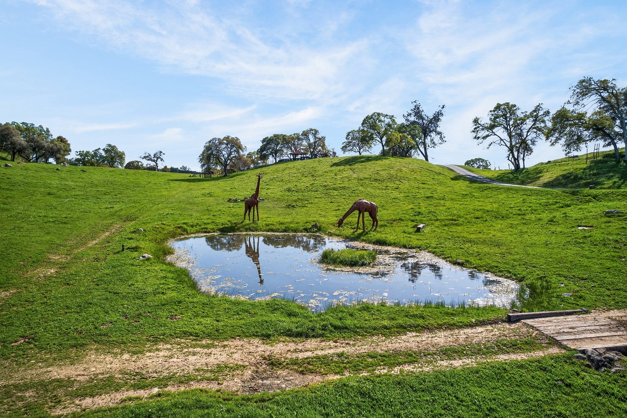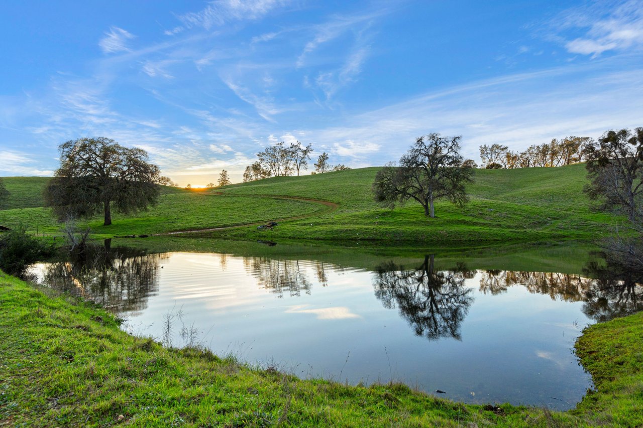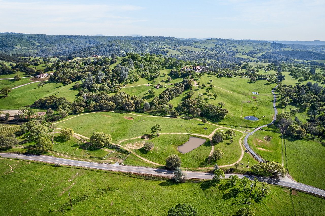 7270 Sutter Ione Road presents a rare 137-acre gated preserve designed for luxury living, recreation, and privacy. Rolling hills dotted with more than 1,000 oak trees are accessed by half a mile of paved roads and three miles of drivable trails. Five ponds, a spring-fed waterfall along Sutter Creek, and seasonal Jackass Creek with a creekside village and cold-water jacuzzi create a striking natural setting. A hilltop overlook captures 180° valley views, with the Antioch Bridge lights and Downtown Sacramento skyline visible at night and Mount Diablo on clear days.