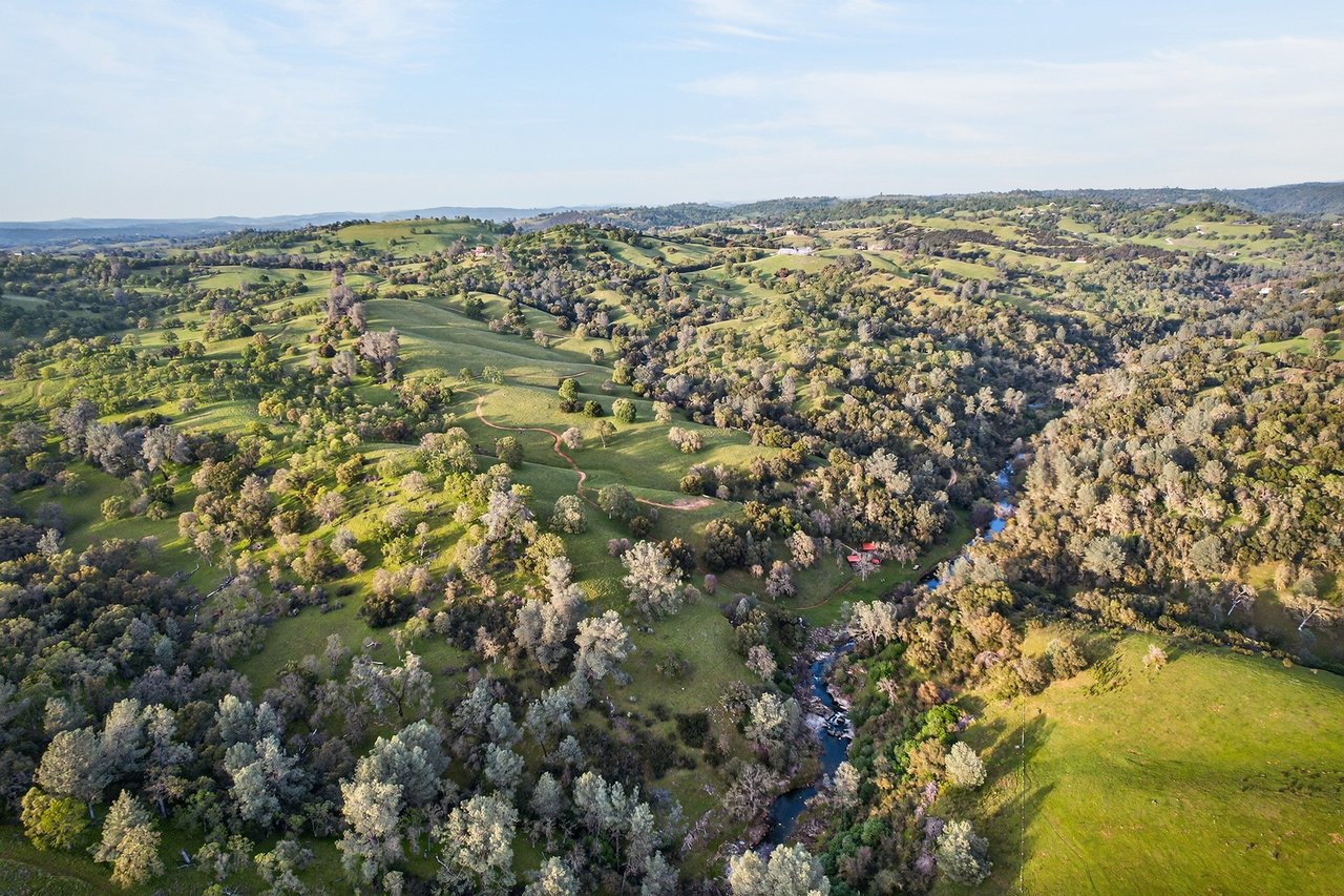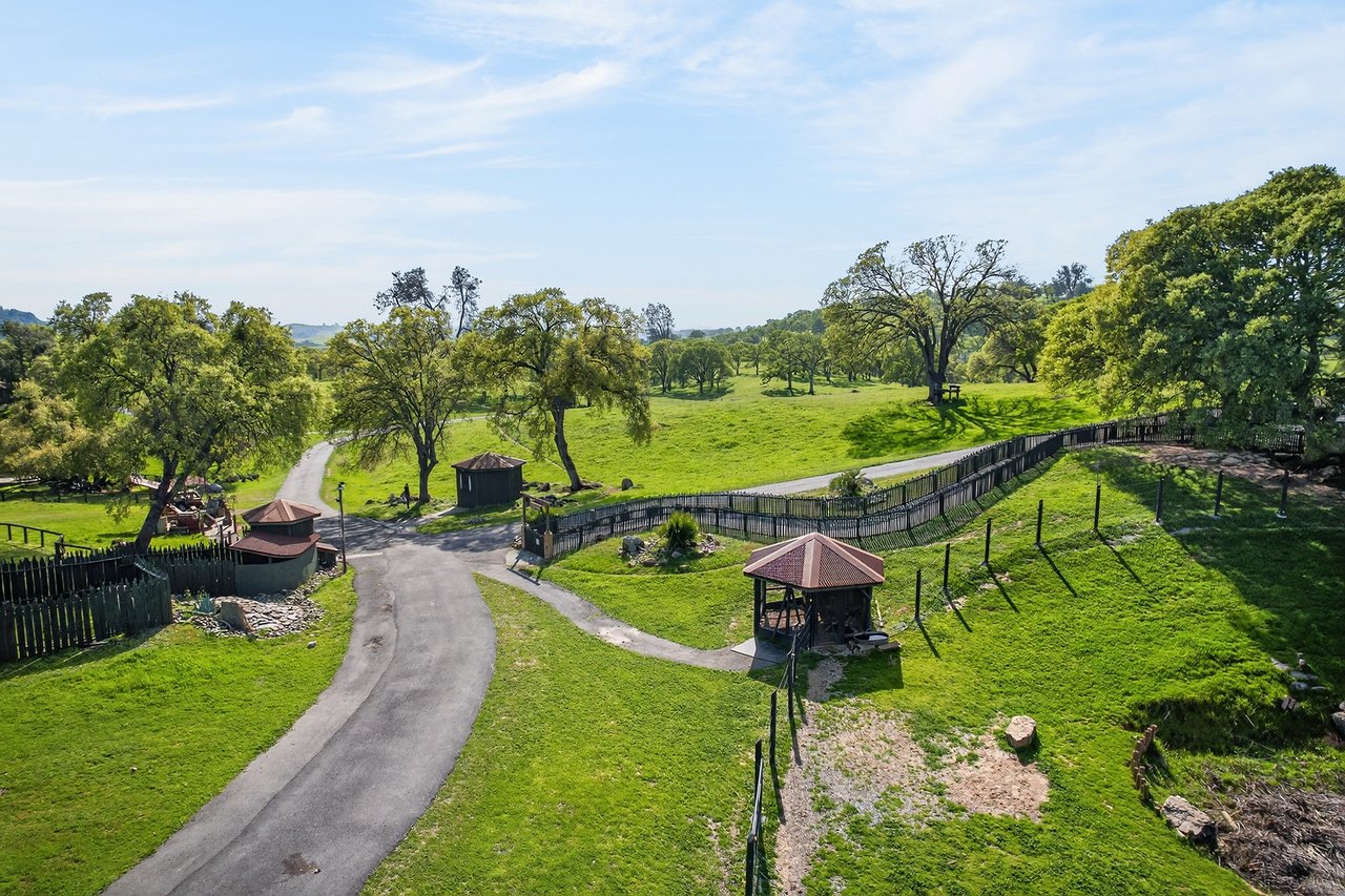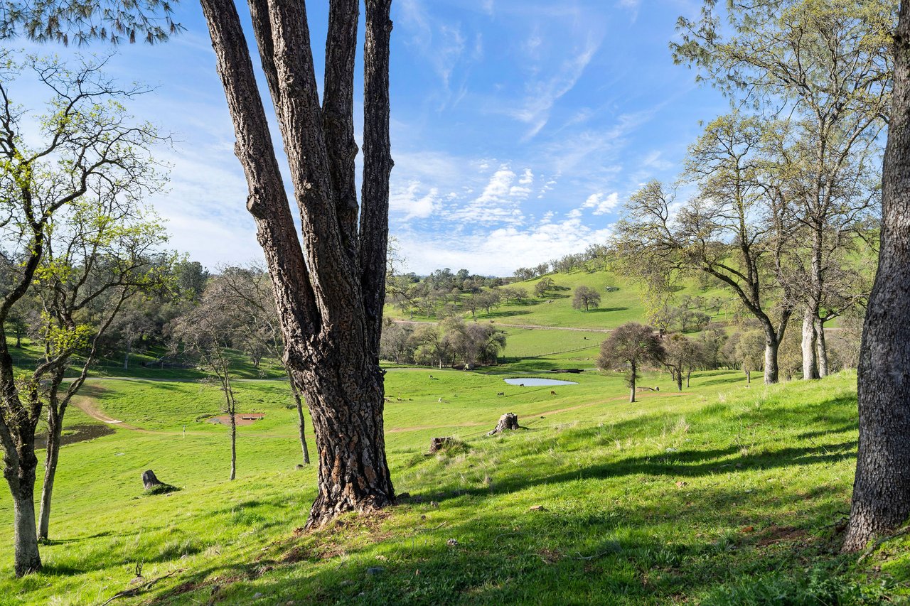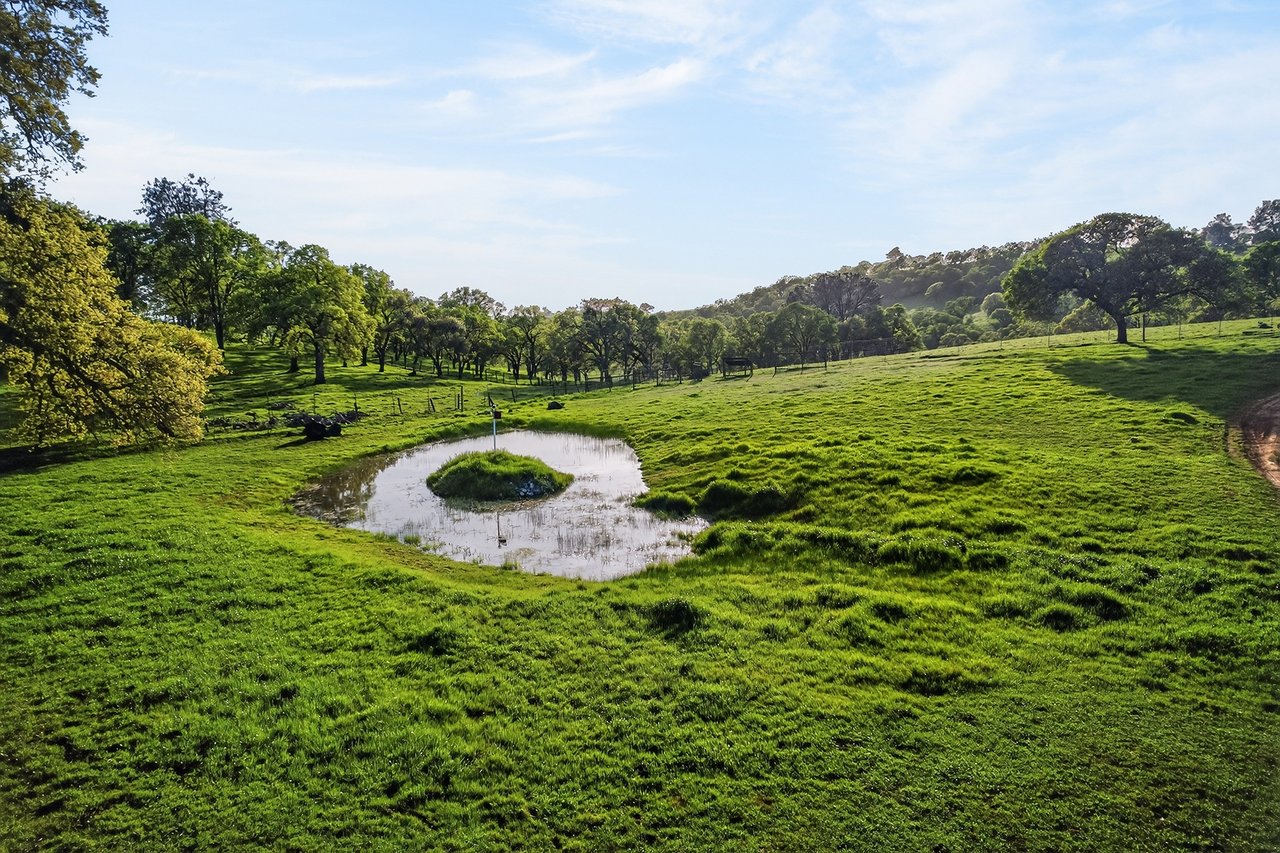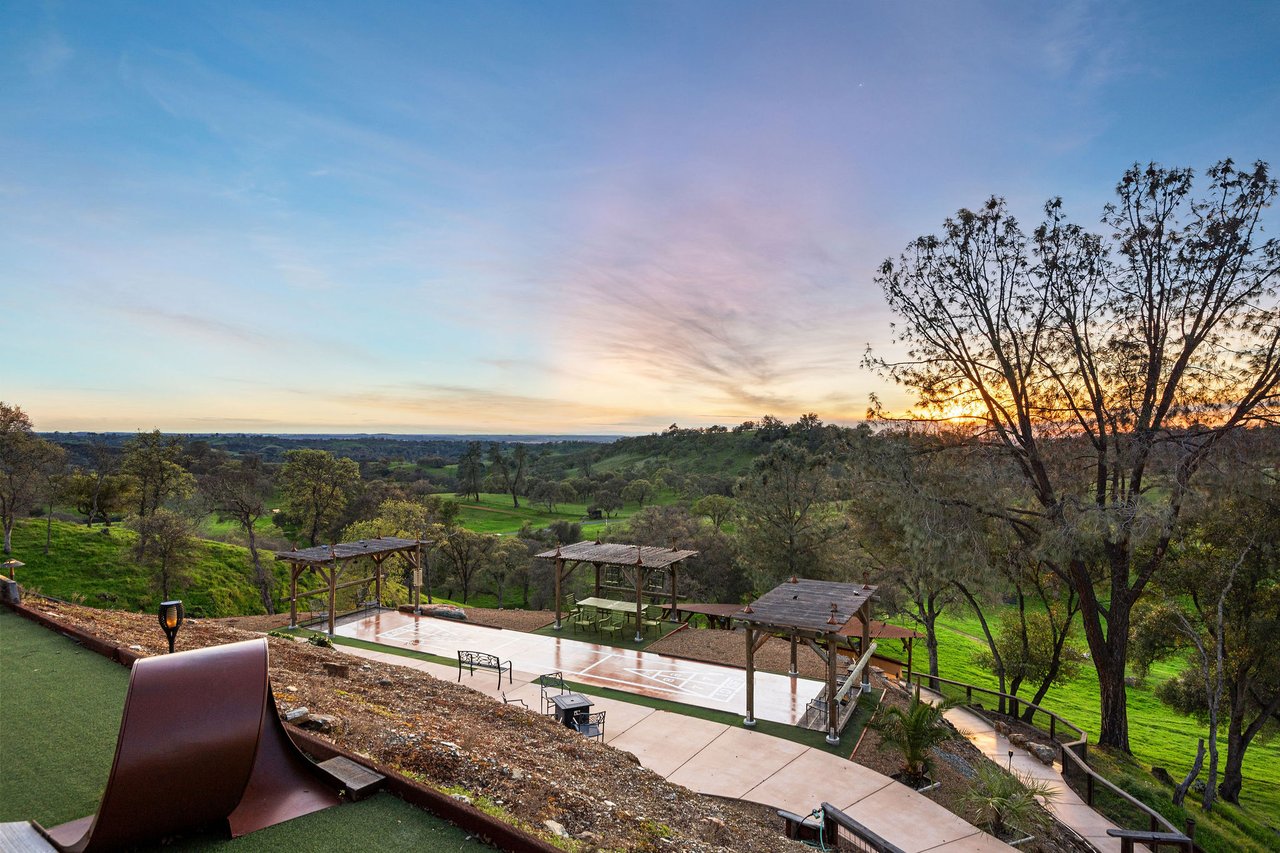 7270 Sutter Ione Road presents a rare 137-acre gated preserve designed for luxury living, recreation, and privacy. Rolling hills dotted with more than 1,000 oak trees are accessed by half a mile of paved roads and three miles of drivable trails. Five ponds, a spring-fed waterfall along Sutter Creek, and seasonal Jackass Creek with a creekside village and cold-water jacuzzi create a striking natural setting. A hilltop overlook captures 180° valley views, with the Antioch Bridge lights and Downtown Sacramento skyline visible at night and Mount Diablo on clear days.