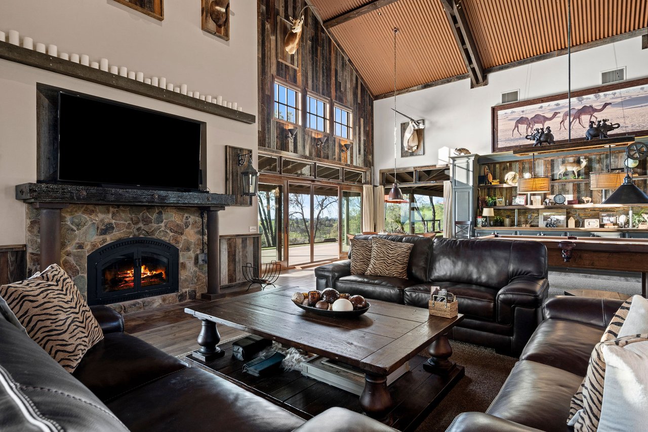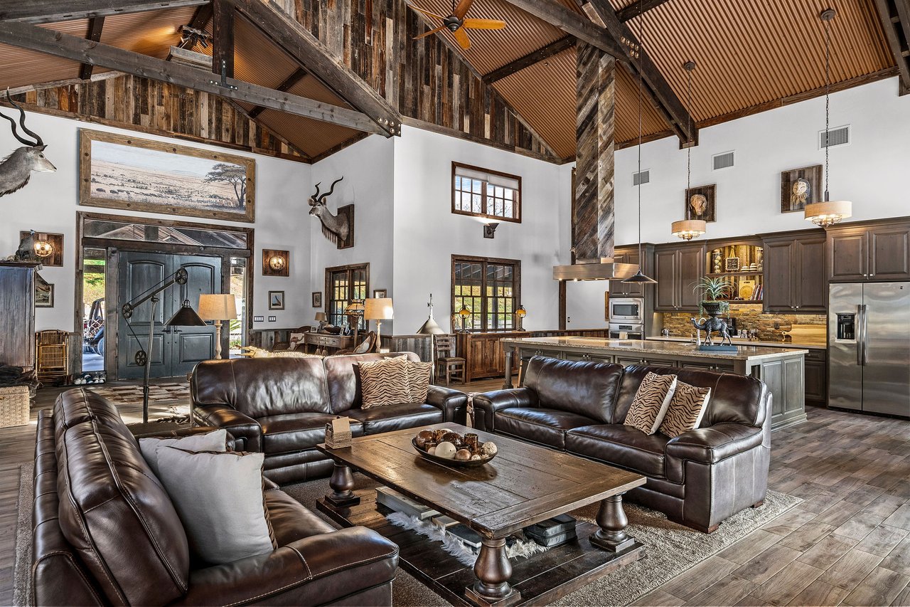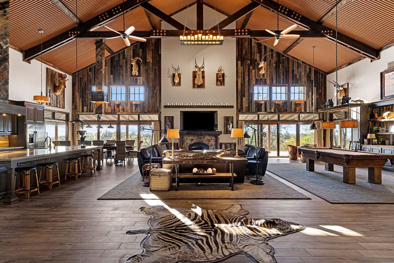 The recently completed Lodge at Oak Hill Preserve offers approximately 6,500 square feet under roof (4,200 livable), fully ADA compliant and single level. The 1,600-square-foot great room features 30-foot ceilings, king trusses, a custom kitchen, dining area, and living space with panoramic views. Five bedrooms each open to the outdoors. Solar, generator, three wells, buried utilities, private helipad, multiple guest structures, and extensive infrastructure complete this exceptional offering.