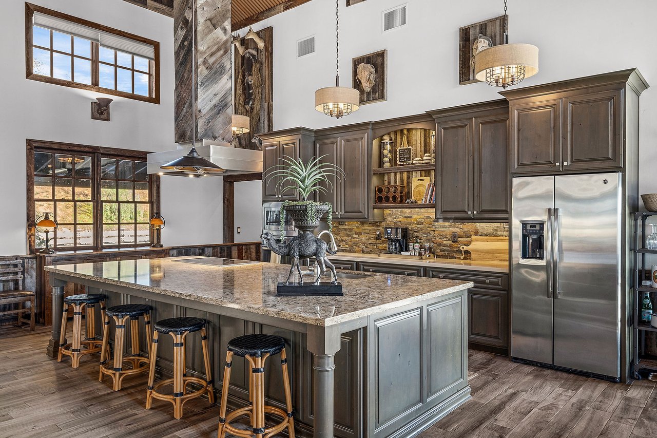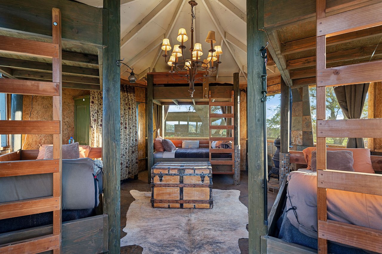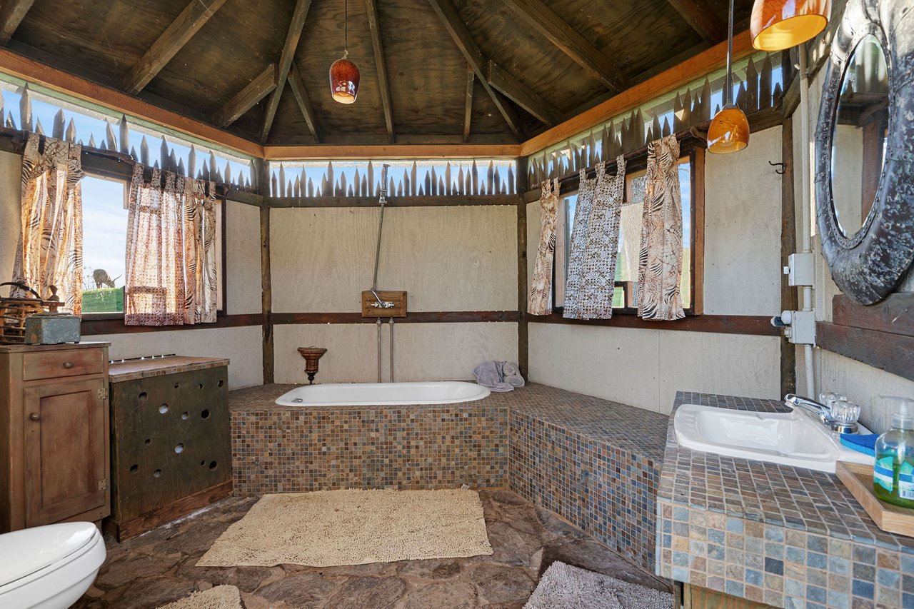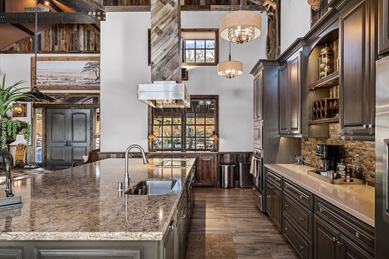 The recently completed Lodge at Oak Hill Preserve offers approximately 6,500 square feet under roof (4,200 livable), fully ADA compliant and single level. The 1,600-square-foot great room features 30-foot ceilings, king trusses, a custom kitchen, dining area, and living space with panoramic views. Five bedrooms each open to the outdoors. Solar, generator, three wells, buried utilities, private helipad, multiple guest structures, and extensive infrastructure complete this exceptional offering.